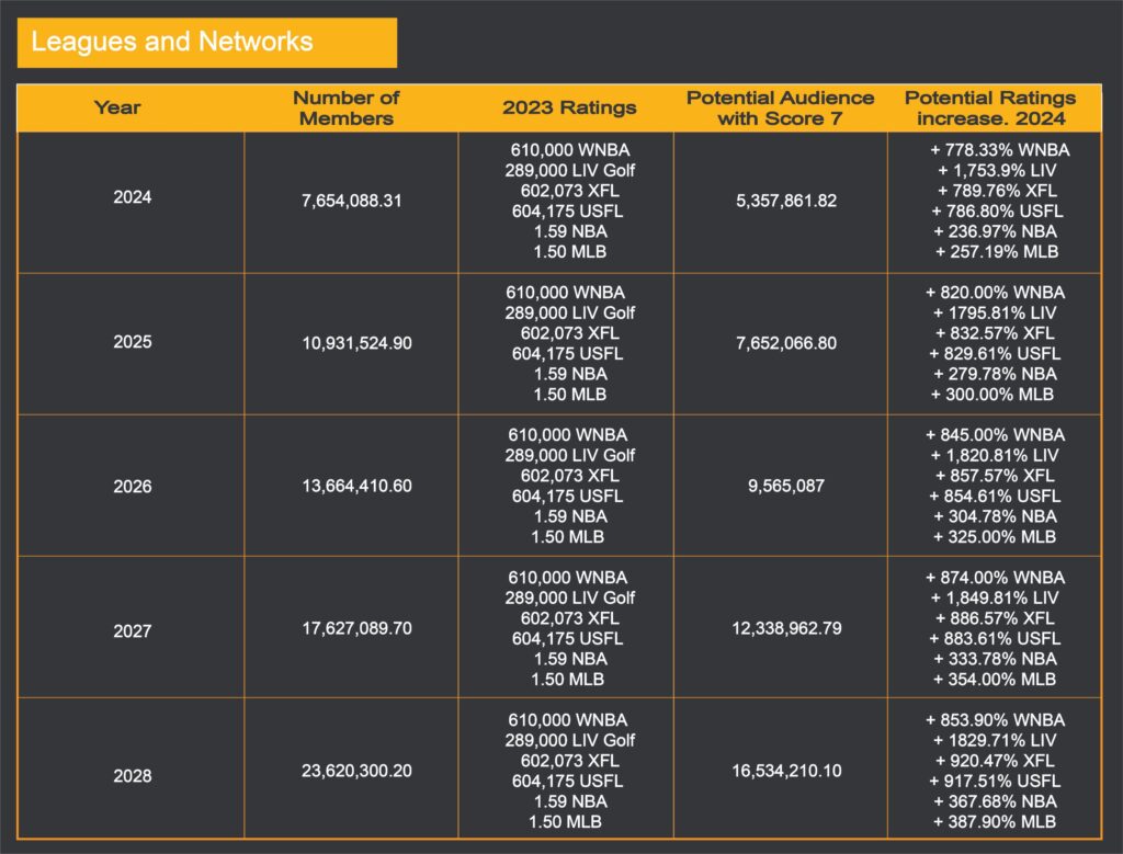 Score 7 will be a game changer for the leagues we work with and the networks that broadcast the games. People participating in sports betting or fantasy leagues don’t have to watch the games to win, all they need are scores or stats that can be found online. What makes Score 7 different is that members must watch the games to maximize their chances of winning. Score 7 will increase viewership. Increase in viewership means an increase in advertising revenue for the league and network.