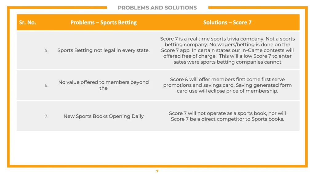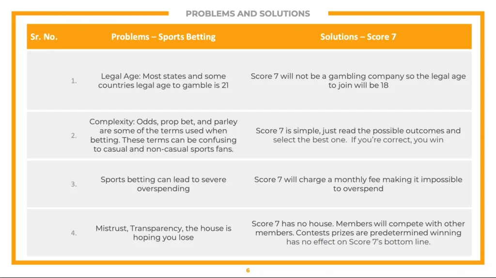The difference; clients will not place anything of value to play Score 7’s In-Game Challenge. Score 7 members will pay a membership fee that will cover the cost of maintaining company functions, promotions, and In-Game Challenges. In some states, a free membership will be offered. The element of consideration does not apply to Score 7. All three elements must be present to be considered gambling.