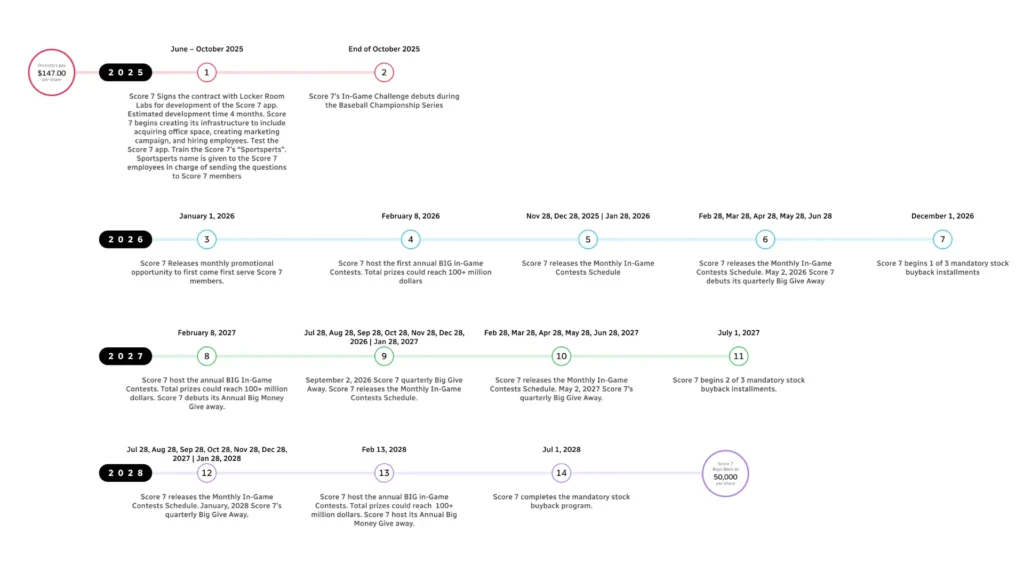 Score 7 projected schedule is subject to change. Some changes will be made without notice. Investors will be notified if Score 7 reschedules the launch date or makes changes to stockholder buyback dates.